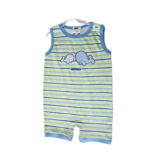 This babies' jumpsuit is accented with multicolor stripe patterns. The two whale motifs add a lovely touch to the piece. The ultra soft and breathable jumpsuit is a great addition to your babies' summer wardrobe.