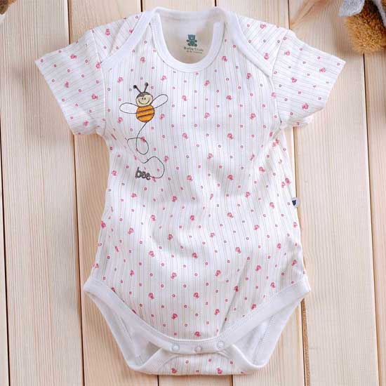 These babies’ rompers feature a short-sleeved design. They are highlighted with allover red bee patterns on the white background. These snug rompers are ideal for summer days.