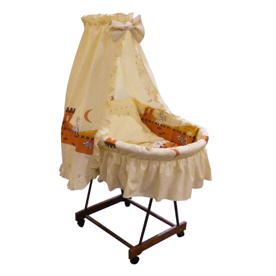 This yellow baby bassinet is made of original handmade wickerwork and which is including four wheels. It includes some accessories, such as a bed, a mattress and a canopy rod. It is suitable for babies between new born baby and seven months old use.