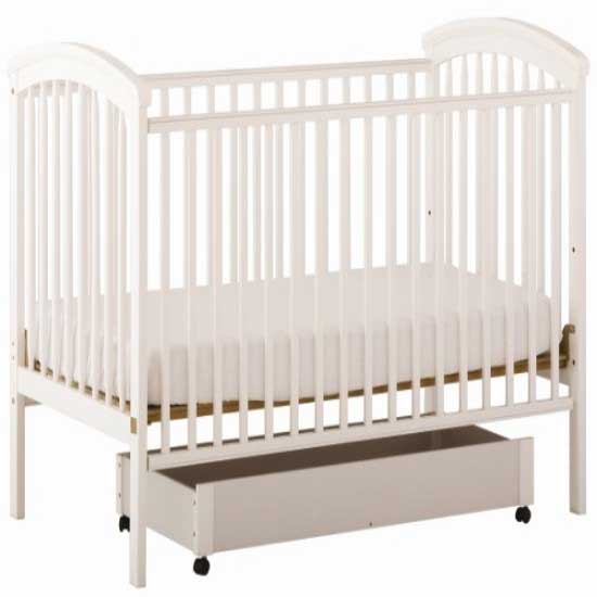 Shown here is a baby bed which comes with a wheeled storage box for storing baby accessories. The wooden construction is painted in white to create a fashionable touch. This versatile baby bed can be converted to a toddler bed which is perfect for fast-growing babies.