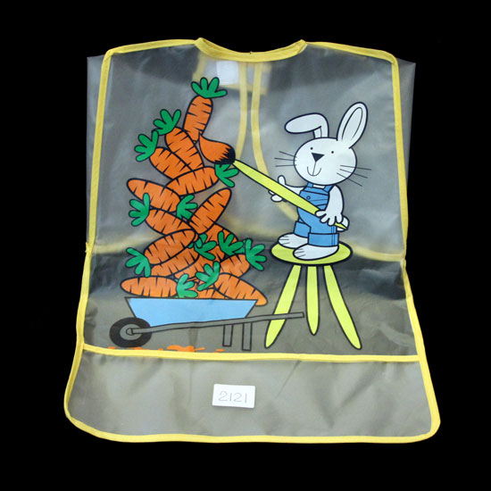 Available is a bib designed with long sleeves to cover your baby’s arms also. The bib is made with non-toxic plastic and printed with vivid graphics. The image of a rabbit collecting his carrots is sure to delight your young child.