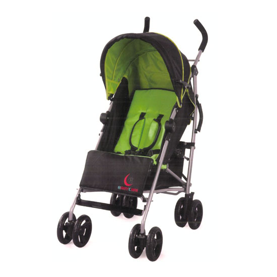 Displayed is a baby buggy featuring a green and black finish. It is equipped with a safety belt for maximum protection. The handles are ergonomically designed to offer a firm grip.