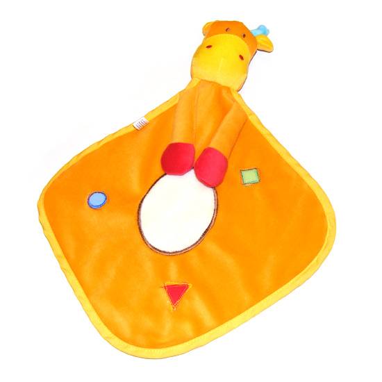 This is a baby comforter features a stuffed giraffe on a conner. This product is made of polyester which can be washed and cleaned easily. It is soft and comfortable.