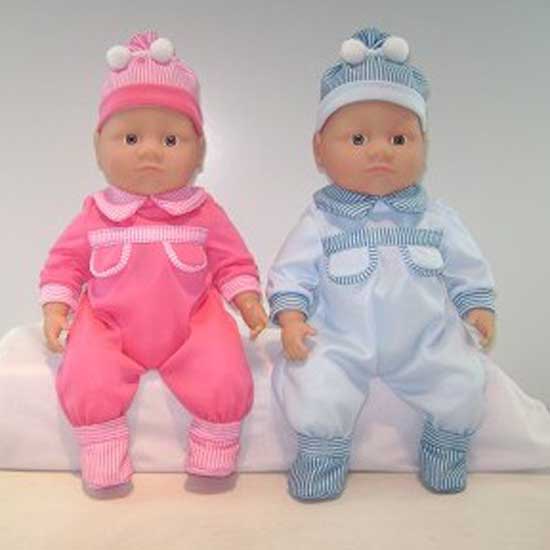 As shown are two adorable baby dolls made of cotton. They are dressed in romper suits with striped flap pockets and collars. The babies catch your attention with pairs of lovely curious eyes.