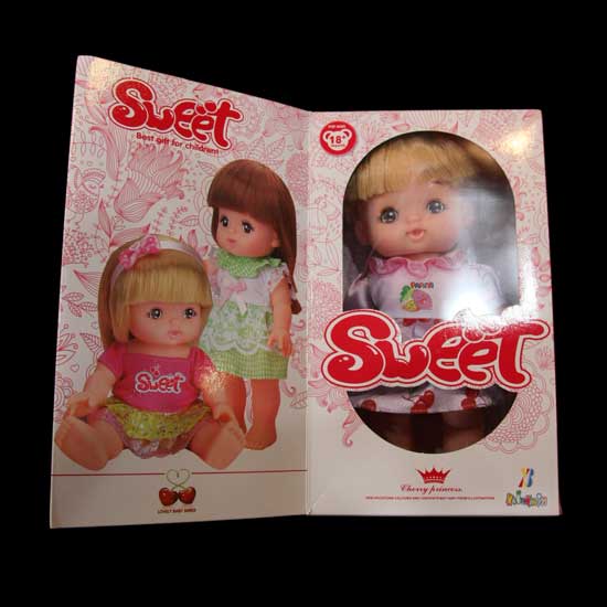 This baby doll features a round face and blond hair, catching little girls’ eyeballs immediately. The girly outfit with fruit prints adds irresistible cuteness to the doll. This baby doll is a great gift for little girls.