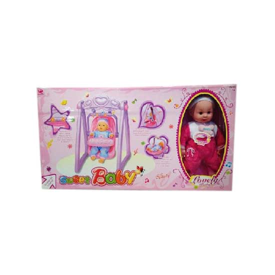The baby doll comes dressed in an adorable outfit in bright colors. The purple-toned swing will bring extra enjoyment of role-play games. This item will become one of your child's favorite toys.