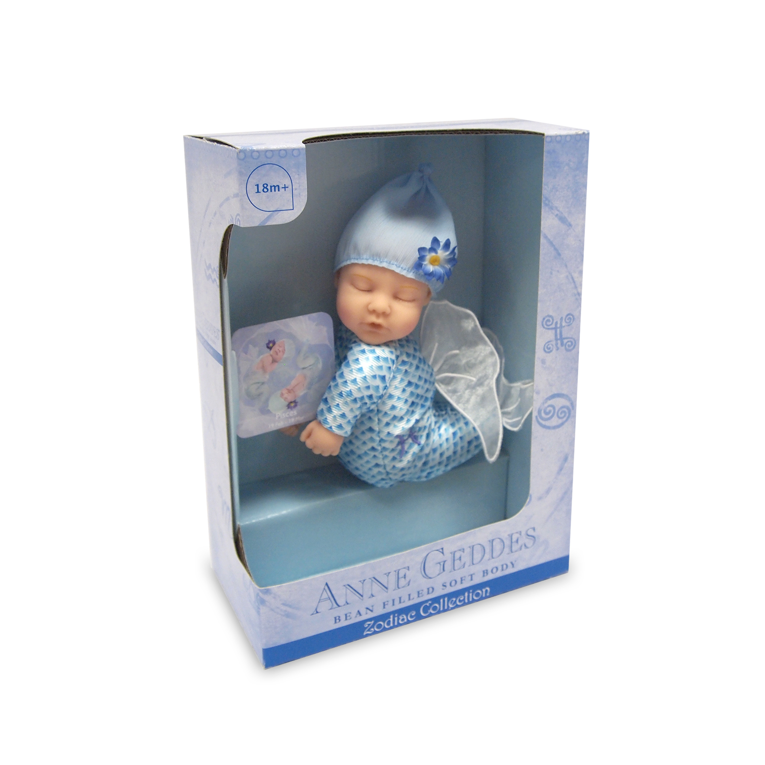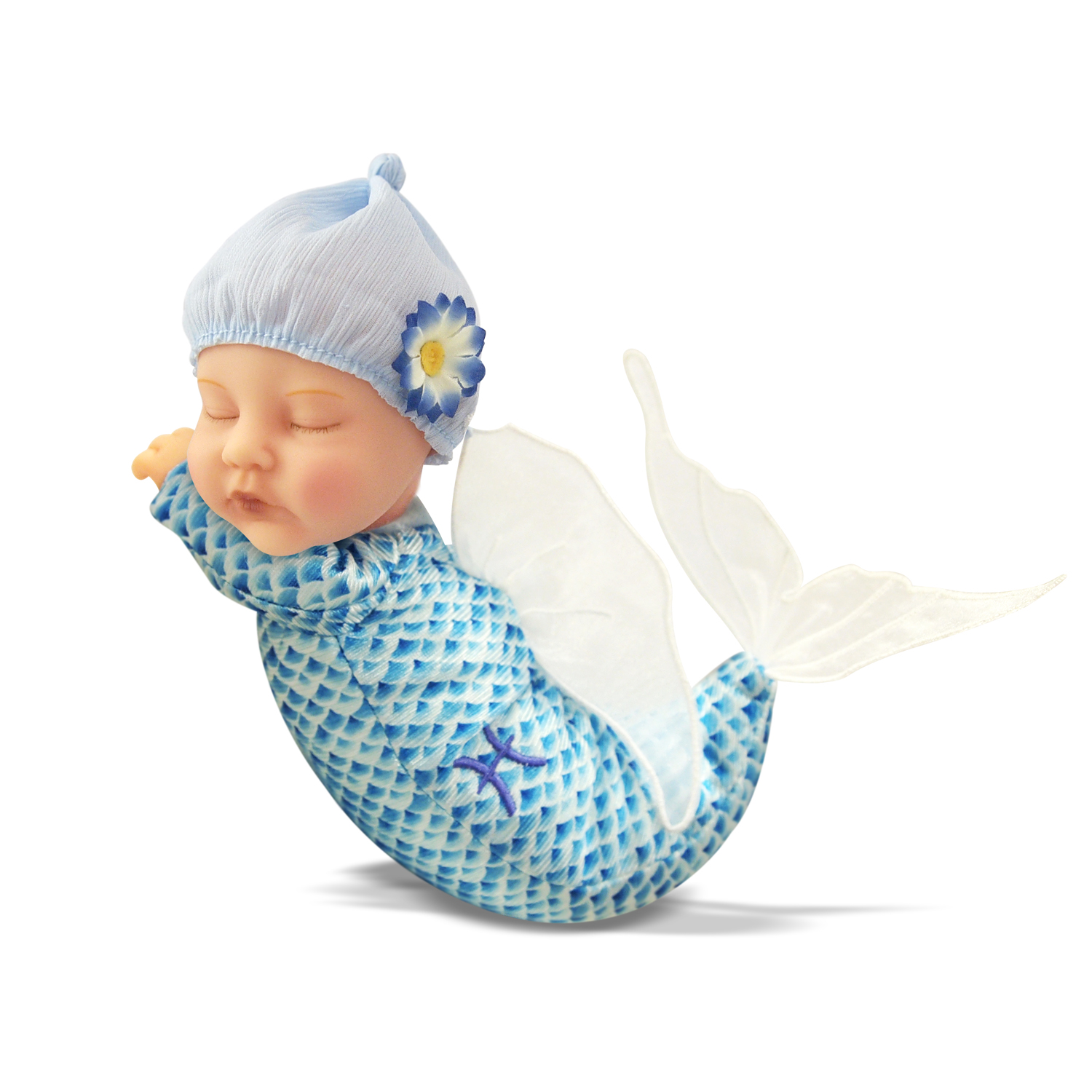 This baby doll is designed with a Pisces motif and has a bean filled soft body. The baby has a cute expression with closed eyes, flushed cheeks and a pouting mouth. It is dressed in a blue overall adorned with a Pisces sign and has a fish’s tail.