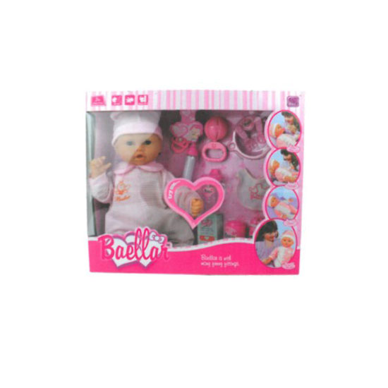 This is a baby doll set with a baby doll and some other doll accessories. All the pieces are well packed in an exquisite packaging box. This baby doll set is an ideal gift choice for your little kids.