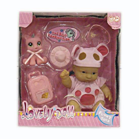 This baby doll toy features a set of lovely accessories. This baby doll set includes a cute pony, a hat, a luggage bag and a headband. The baby's clothes can be removed and are machine washable.