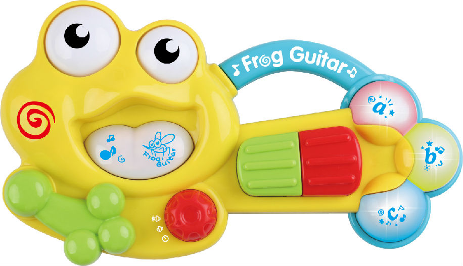 Introduce your little ones to music with this toy guitar. The adorable frog design gives a whimsical note while depicting switches and buttons to encourage touch, reach and feel. Lightweight in construct, it styles a curved handle to ensure easy carry, suitable for outdoor and on-the-go play.