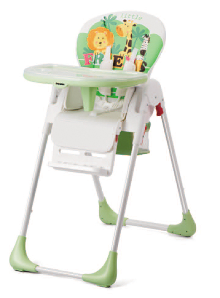 This baby high chair comes with a big tray underneath for storage. This infant feeding chair has a five-point seat belt to guarantee safety of the baby. This dotted infant high chair has a big tray for food and toys.