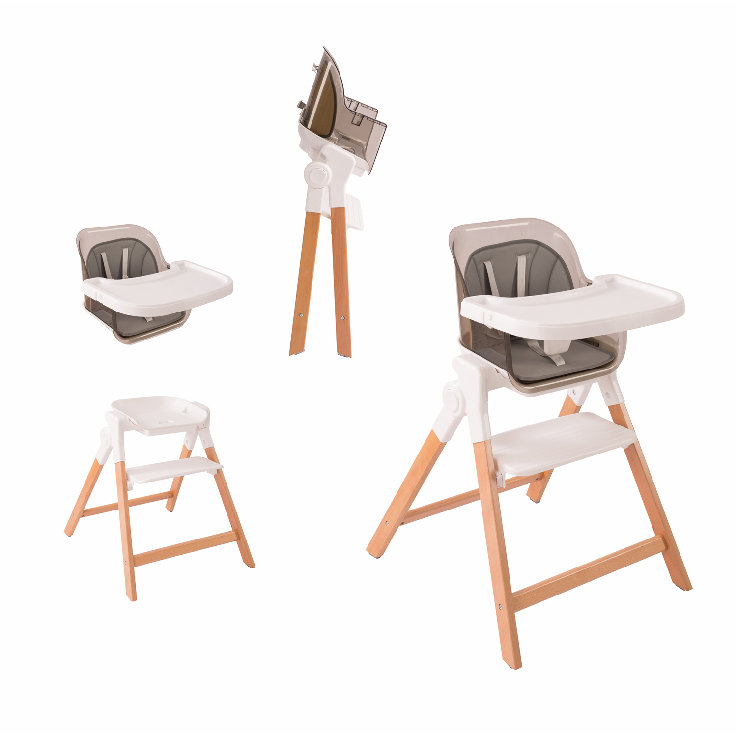 Solid beechwood. Eco-friendly.Easy fold-up for storage. Remove seat plate, footplate, and tray directly and easily 11-position of height so that it can be used as a toddler chair or a dining chair for all ages.Max.Weight Recommendation 110kg.