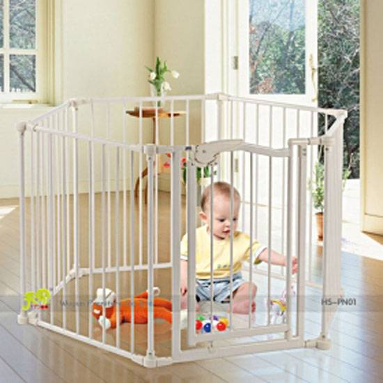 The pressure-mounted metal playpen features a 90-degree metal door with an automatic lock. It is easy to install without any hardware or tools required. Ensure babies' safety by limiting their activity area with this robust metal safety gate.