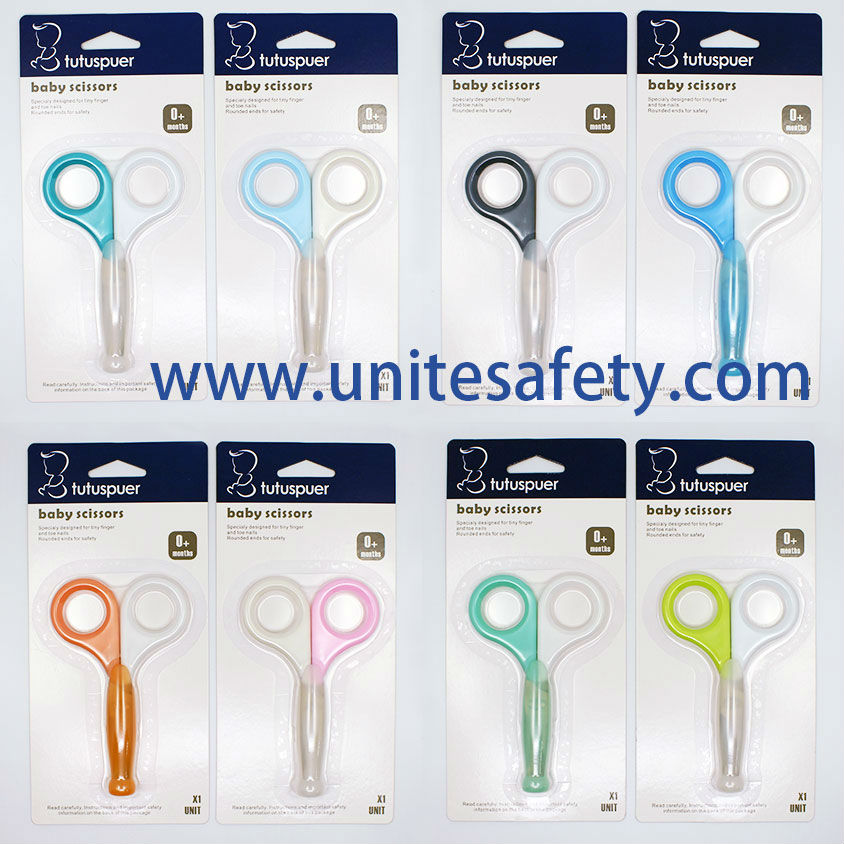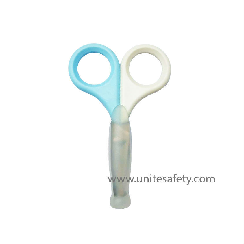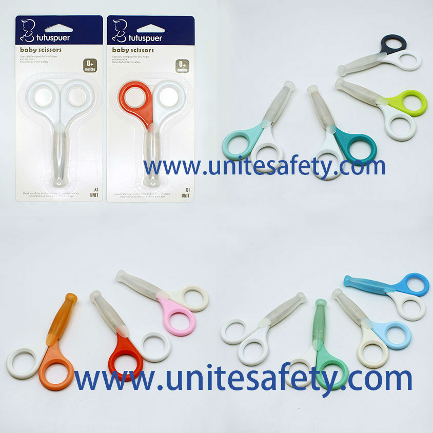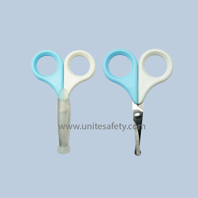 This pair of scissors has blades with rounded heads for safety and has handles in different colors. It has a cap for covering the blades and can stand up on the desk for easy usage. The scissors can be used for the delicate task of trimming the tiny nails of babies and prevents babies from hurting themselves with long grimy nails.