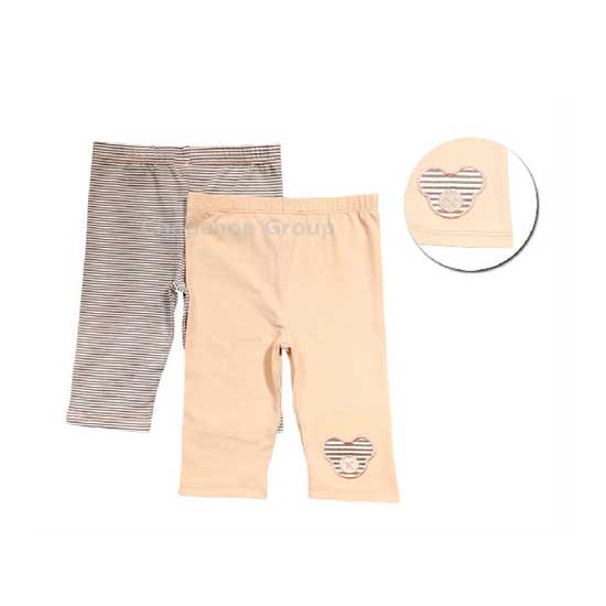 Displayed is a pair of baby pants that is available in different colors. Made of high quality knitted cotton, these pants are soft, flexible and breathable, perfect for babies that like to move around. These baby pants are designed with lovely patterns.