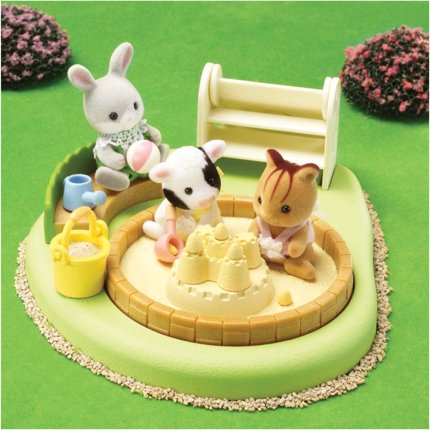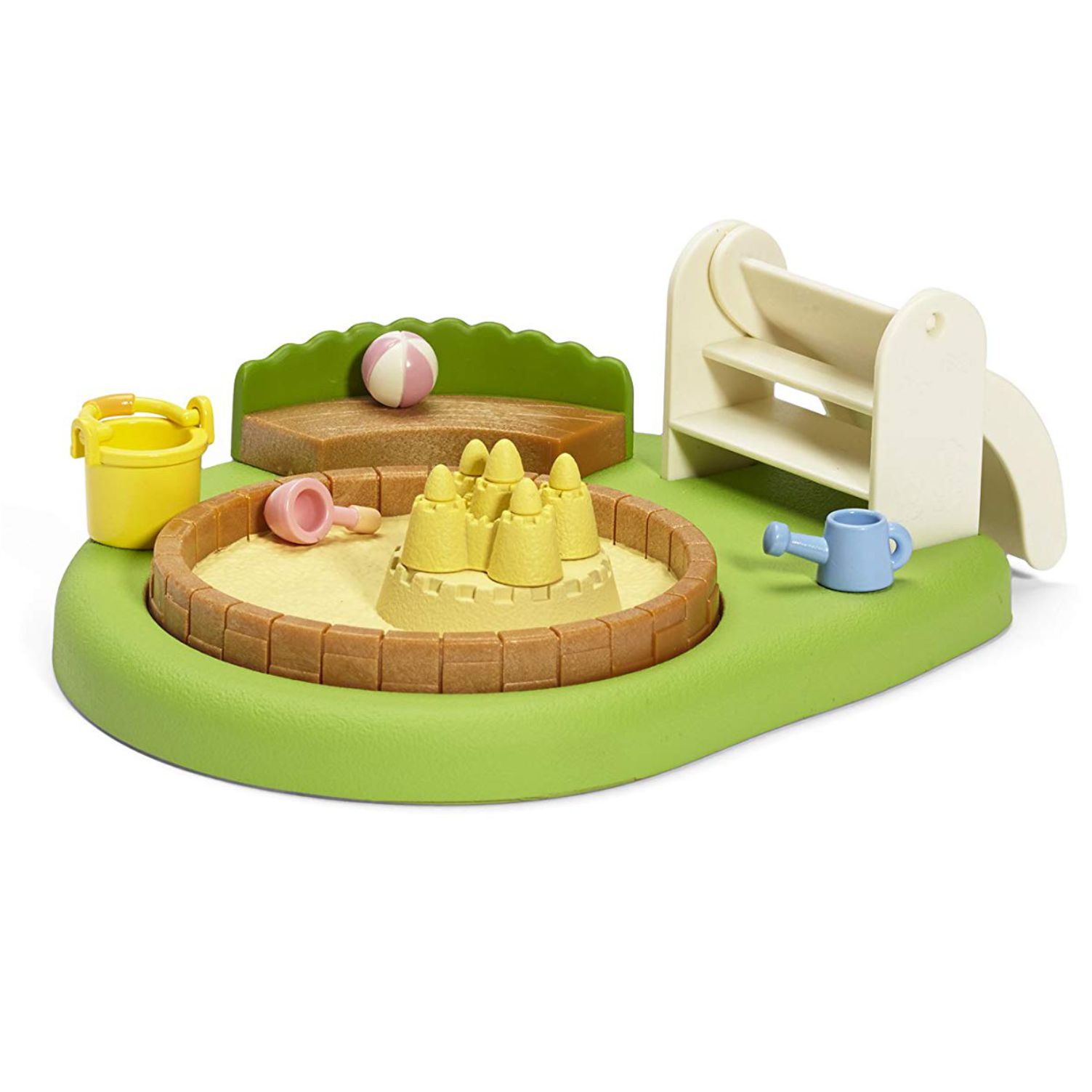 Also included are bench, sand castle, bucket and shovel, 5 scoops of sand, beach ball, and watering can