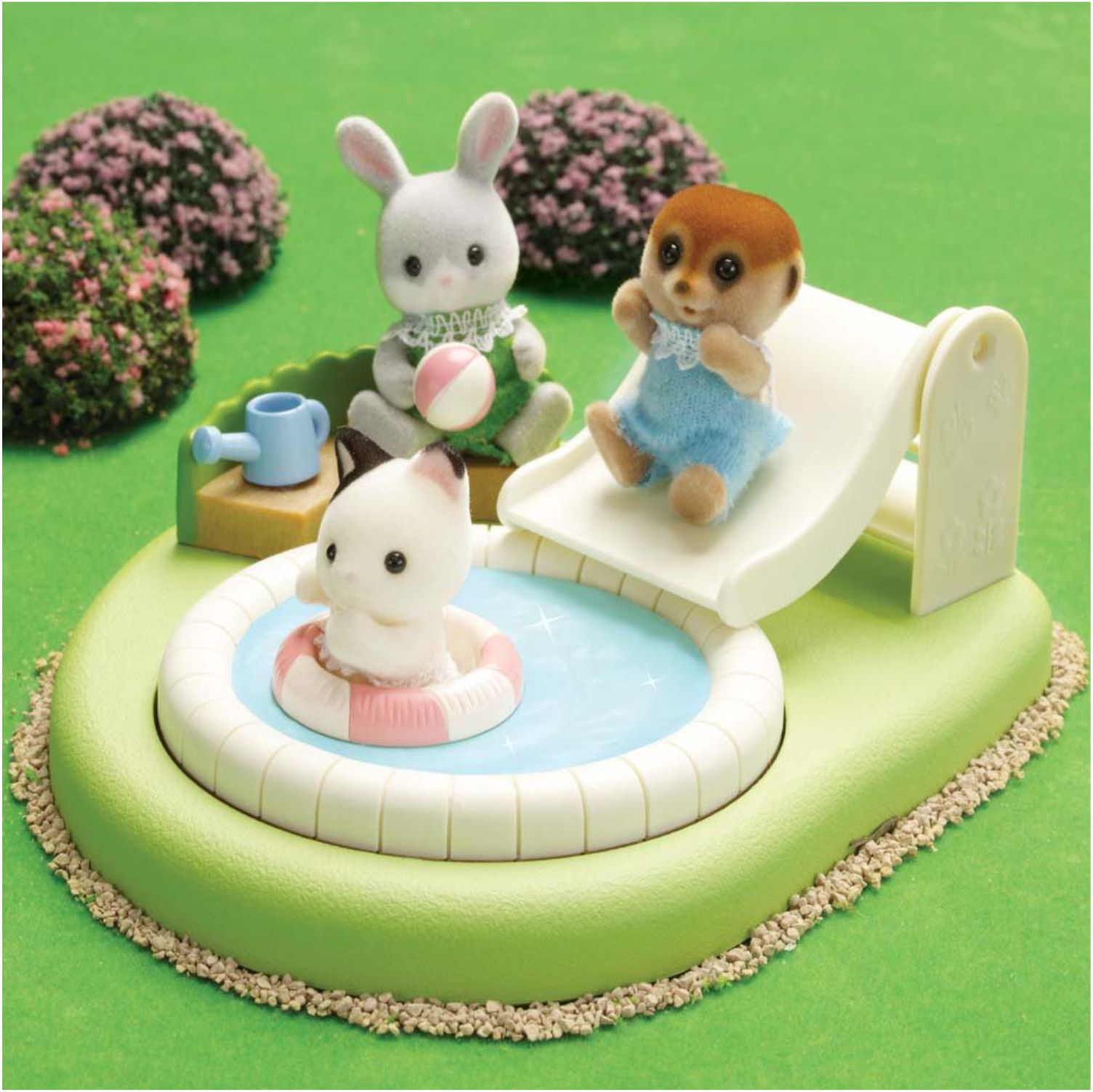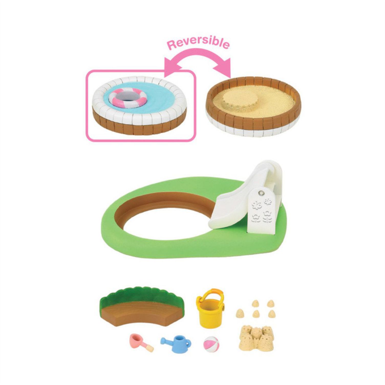 Includes reversible sandbox and pool plus play area with slide and stairs, pool with swim tube and sandbox with sand castle stand