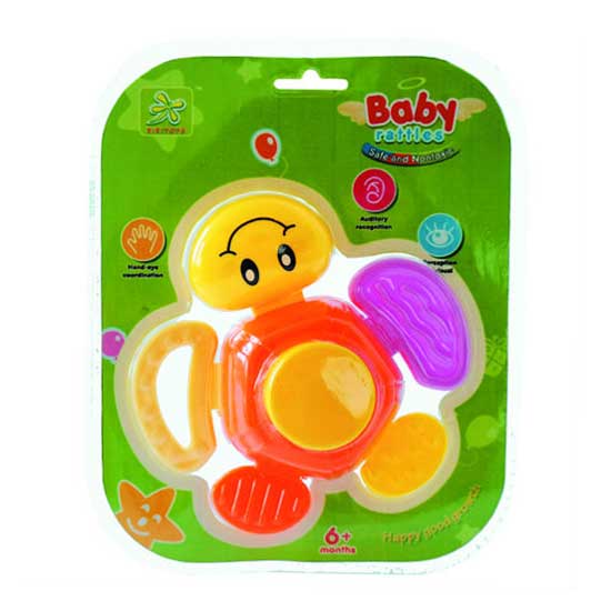 Displayed is a baby rattle that comes in a colorful design. Featuring multiple components, this baby rattle produces cheerful sounds. With this easy-to-play toy, your baby can entertain itself all the time.