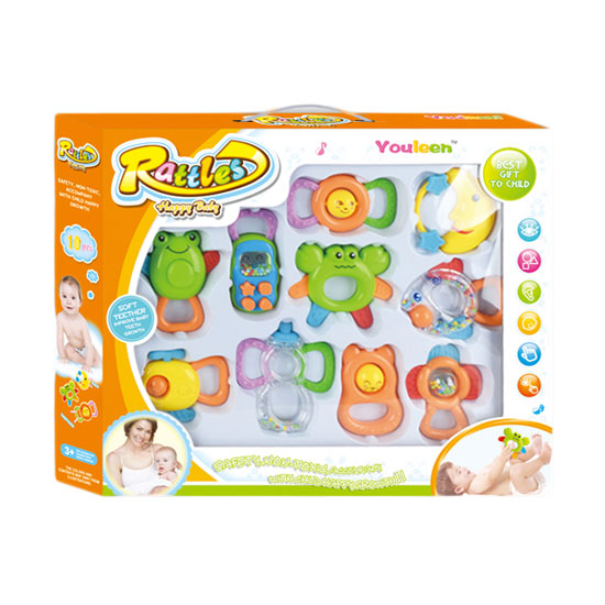 Featured is a 10-in-1 rattle box set with excellent quality. Each rattle is finely designed to stimulate both babies’ auditory and visual senses. This box set is certainly the best gift for any baby.