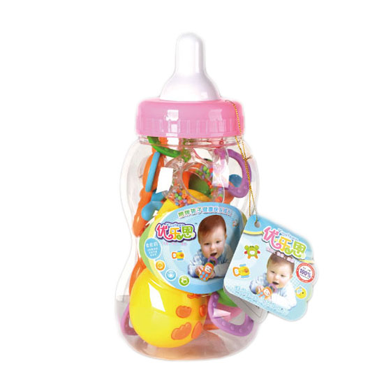 Featuring a baby bottle packaging, these rattles can surely delight any baby. The rattles can generate small sounds with the little beads inside to stimulate babies' auditory senses. Their bright colors and interesting designs are also visually stimulating.