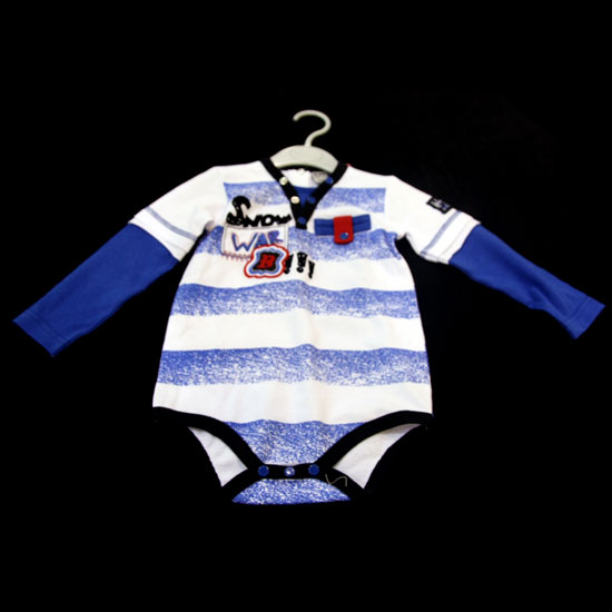 The baby rompers made of cotton wrap wearers with satisfying comfort. They feature a faded striped background with funny text on top. The long sleeves display a double-toned design for visual interest.