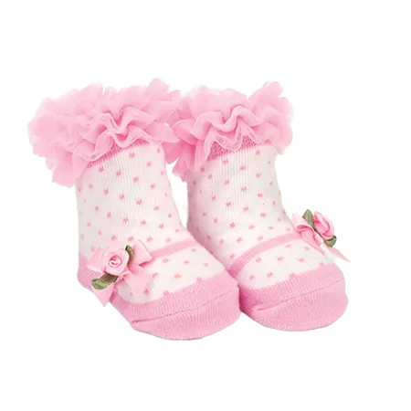 This pair of baby socks are made of soft cotton that is comfortable for babies and even newborn babies. It comes with a dots pattern, poly chiffon flower puffs at the ankle, and cute little flowers. These are lovely and sweet.