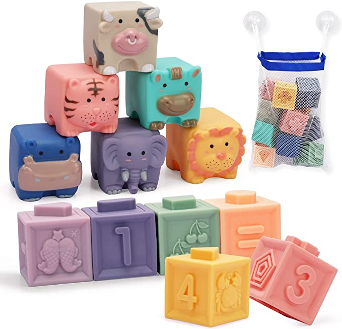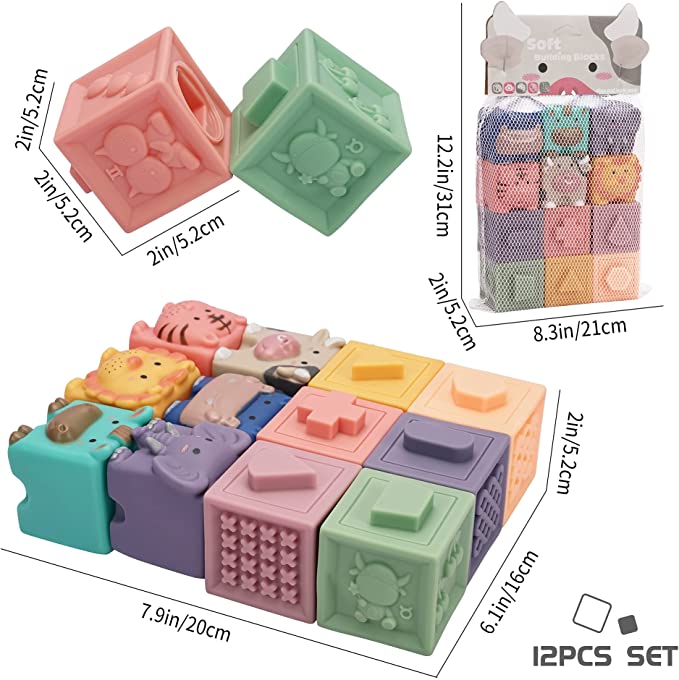 12-Pieces Soft Building Blocks — This set included 6 pieces of 3D animals shape blocks, and 6 pieces of soft cube blocks, they have an embossed animal, shape, fruit, Arabic numerals, and geometrical patterns on the sides. Children develop their sense of touch and vision by touching and observing these sensory patterns.