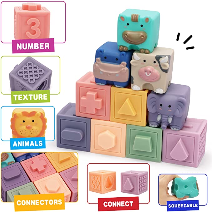 Early Learning Play — This block for baby provides various fun for the child. Super soft and easy to squeeze entertaining baby blocks that make a squeaking sound for toddlers and babies to play. Encourage reaching and grasping, its cute noise help attract the baby's attention. Baby will also enjoy stacking or knocking them down. In the process of playing, babies can exercise hand-eye coordination and grasping ability. They are great for toddlers' early educational and motor skills development.