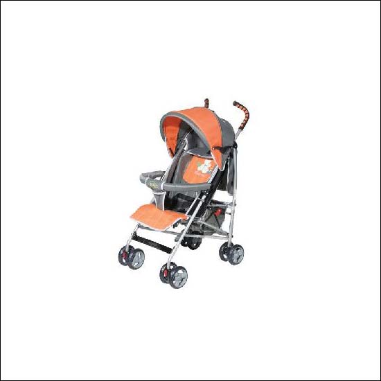 - The color of the baby stroller is orange and black
