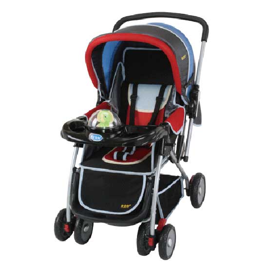 This baby stroller looks modern and fashionable in a black-and-red match. The backrest allows three-position adjustment to provide comfort when babies sit, lie and sleep. Brakes are set on both front wheels and rear wheels for enhanced safety.