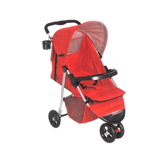 This is a baby stroller designed in bright red. It comes with a bottle holder on the handle for added comfort. The rugged frame and robust fabric promises durability and sturdiness.