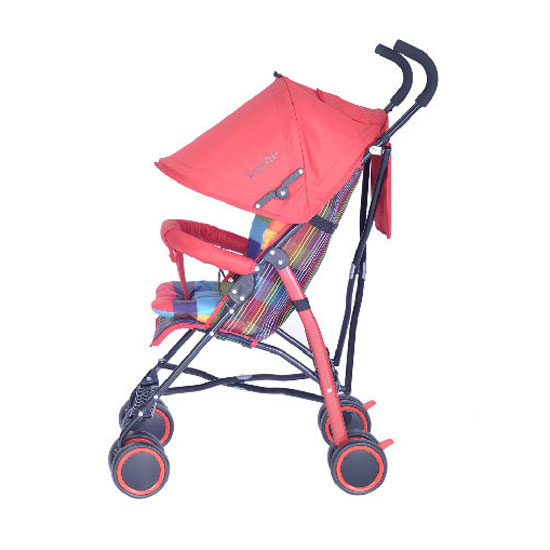 This baby stroller flaunts a touch of stylishness with the colorful seat. The front swivel wheels with suspension and fixed rear wheels with brakes ensure your easy and flexible control. This stroller is convenient to push with the two ergonomic handles.