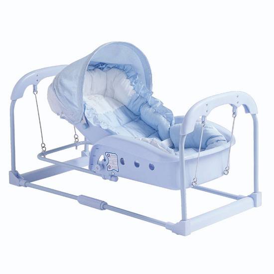 The baby swing features a cradle lined with soft bedding. It boasts a foldable construction for better storage. Gently rock your babies to sleep in this baby swing.