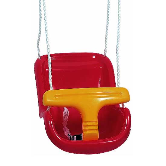 This is a baby swing featuring a durable structure and a sturdy safety belt. It features a red seat with a yellow front and wear-resisting ropes. This baby swing allows your baby to have a fun time.