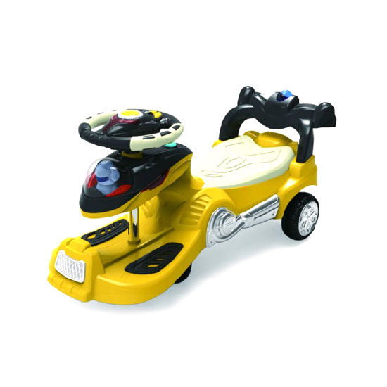 This baby swing car features a yellow finish. It is equipped with big rear wheels for smooth and stable movement. It is ideal for parks and playgrounds.