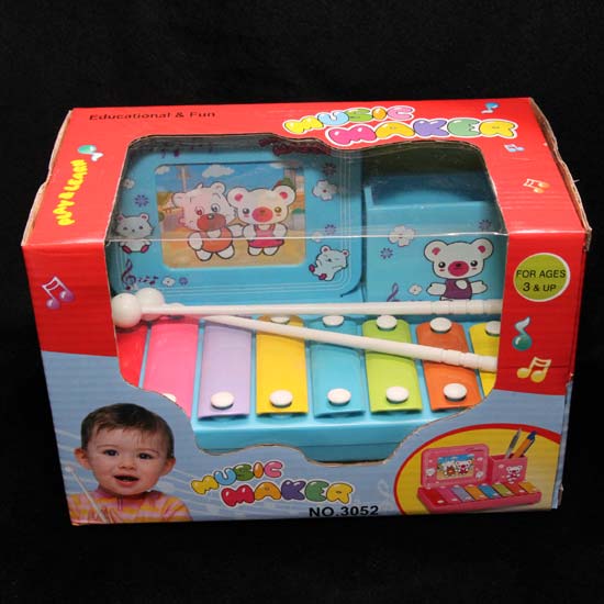 Showcased is a baby xylophone set in a cute style. The set includes a desk photo frame and a pen stand embellished with lovely cartoon characters which are definitely appealing to babies. The xylophone produces harmonious musical sounds.
