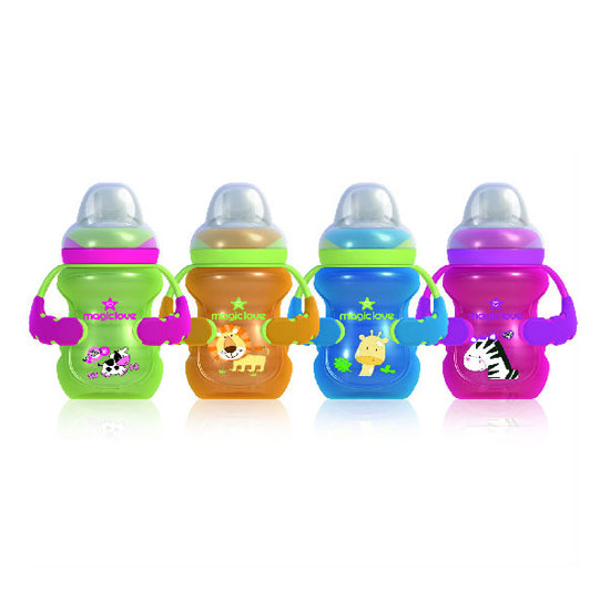 This zippy cup can give your baby independence in learning how to drink. The special curved handles provide added comfort for your baby's hands. This series of cups also features adorable designs with cute animal decorations on the surfaces.
