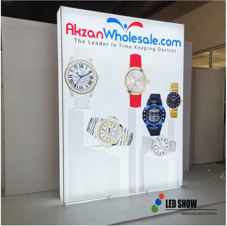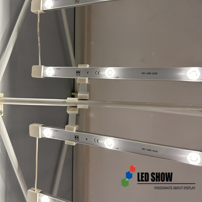 The customized hooks are very convenient for fixing the exhibition lighting on the SEG Systems Backlit Popup Displays.