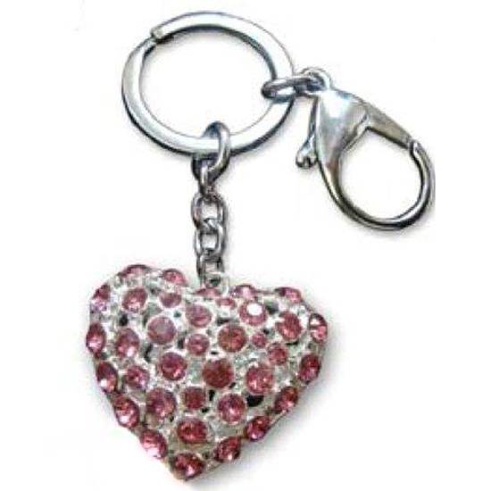 This is a bag charm made of silvery metals and decorated with red brilliant cut sparkling stones. The bag charm can be used as key chain.