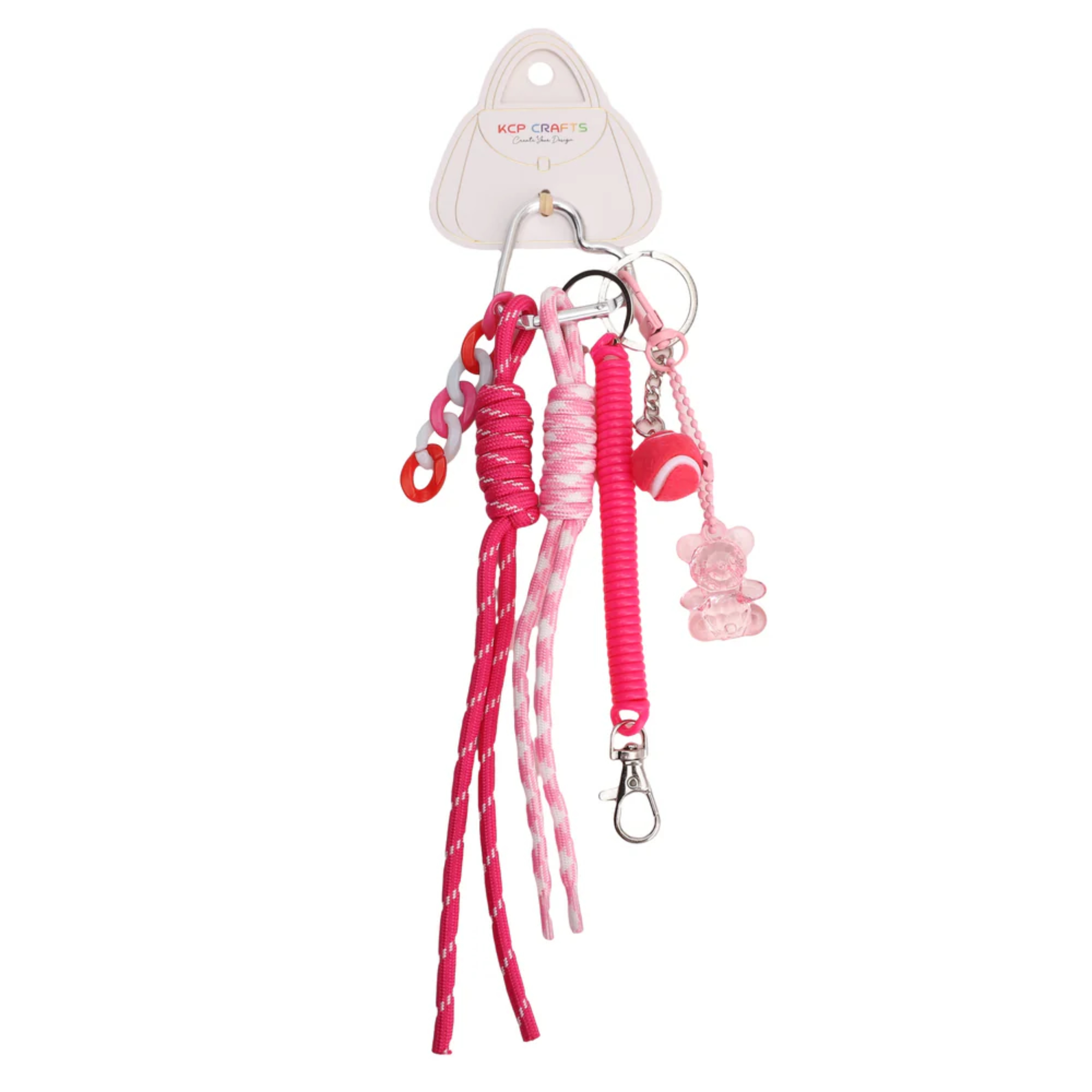 This pink-red multi-strand bag chain features braided cords, tassel details and cute charms, perfect for adding a sweet, playful touch to bags.
