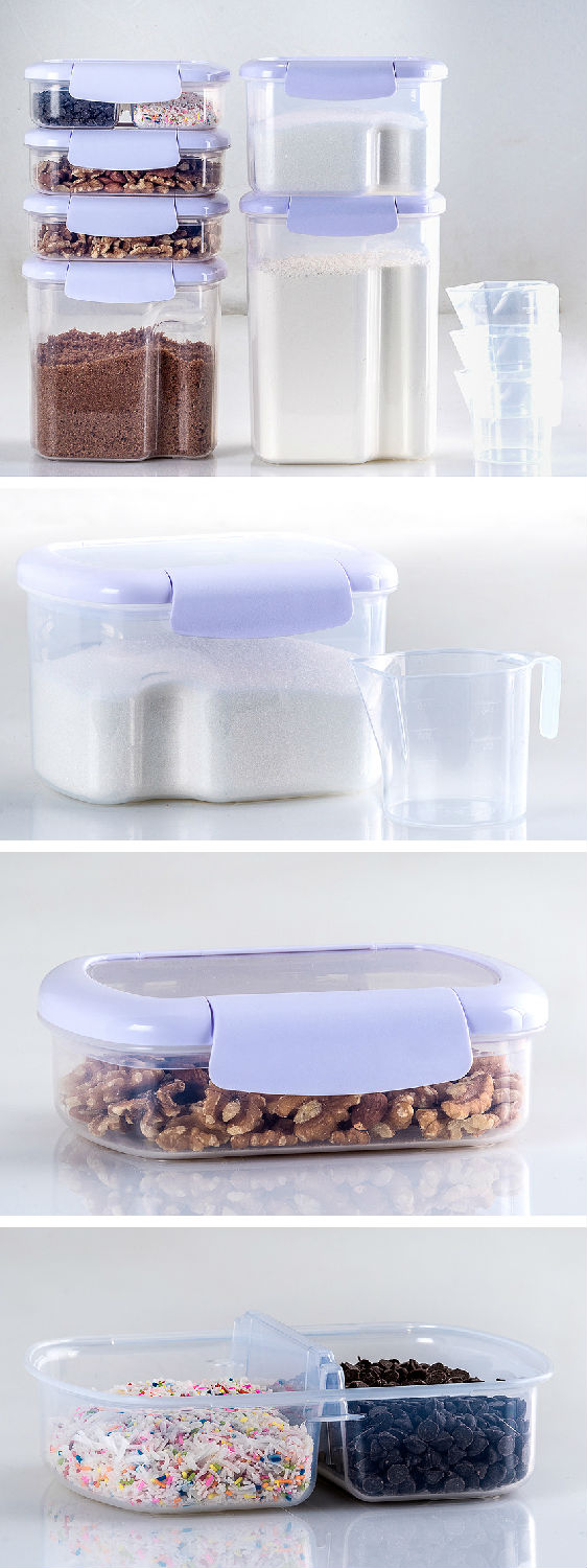 This is specifically designed to keep all your baking ingredients fresher than ever. For example, the 1.6L, 2.4L and 3.2L is design to store cocoa power, sugar and flour and come with a measuring cup. 630ml divided and 680ml container is ideal for storing various typs of toppings such as chocolate chips and almods.