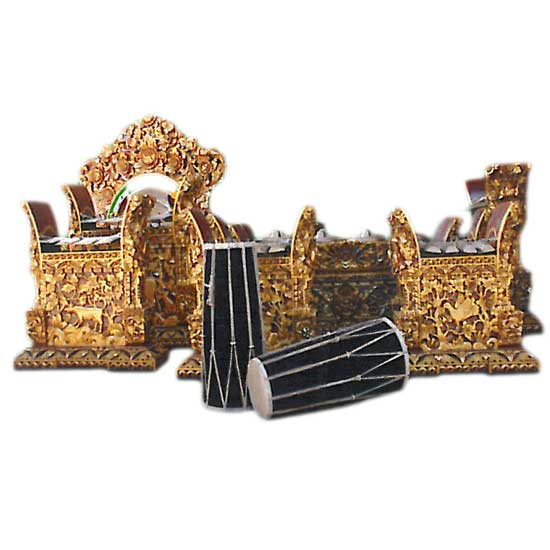 Here is a set of Balinese traditional musical instruments called angklung. It is employing a 4-tone scale to play music for celebrations and rituals. The angklung is carved with delicate patterns and painted with gold to showcase solemn glamor.