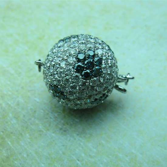 The presented 16mm ball clasp showcases a glamorous accent. It is embellished with 245 pieces of white diamonds and 45 pieces of blue diamonds. This ball clasp will surely add an opulent touch to your jewelry.