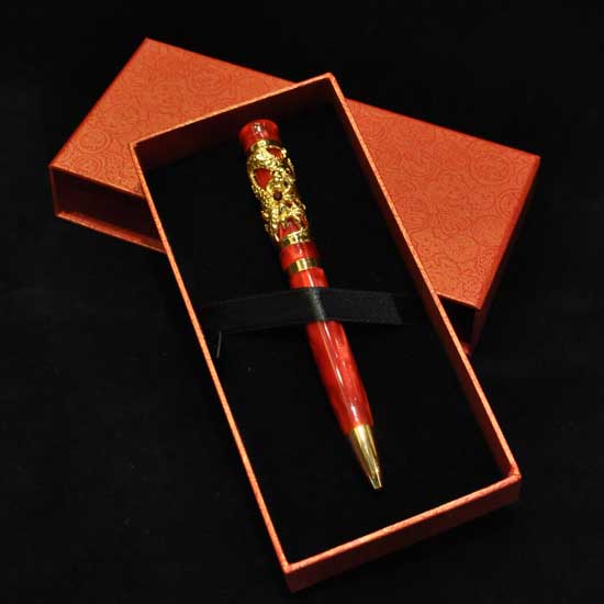 The featured ball pen exudes a traditional design with a golden dragon decoration. A shiny crystal is added on the top for extra style. The pen possesses a glossy finish for long lasting beauty.