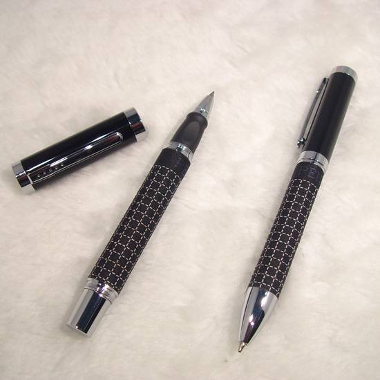A set of roller pen and ball pen is in classical design. There is a metal pen clip on top. It has a smooth outer case.