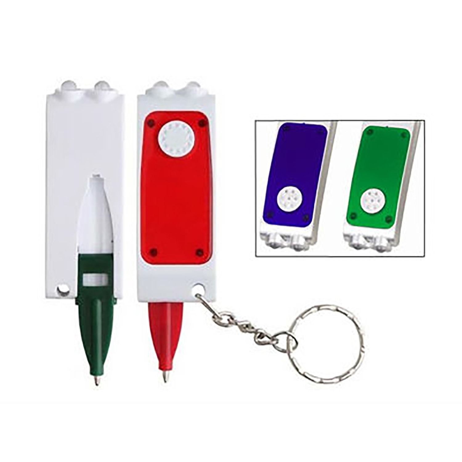 The featured keychain is equipped with 2 LEDs and has a mini ball pen folded inside. It comes in a compact rectangular shape and offers simple on / off switch operation. This keychain has a round split ring for attachment and is ideal for promotion use.