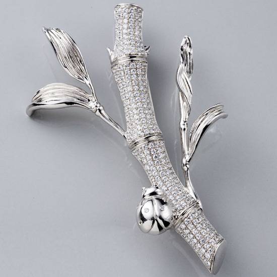 This bamboo brooch is silver in color, with white stones micro set on the bamboo. There are leaves with nice posture and pattern making the bamboo design being more lifelike. Nickle is not used in plating unless requested by order.