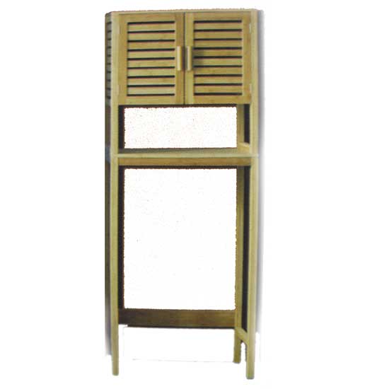 As shown is a rack constructed with bamboo and melamine. It is assembled with a small cabinet closed with louvered doors on the top. The whole piece is securely bolstered by four legs.