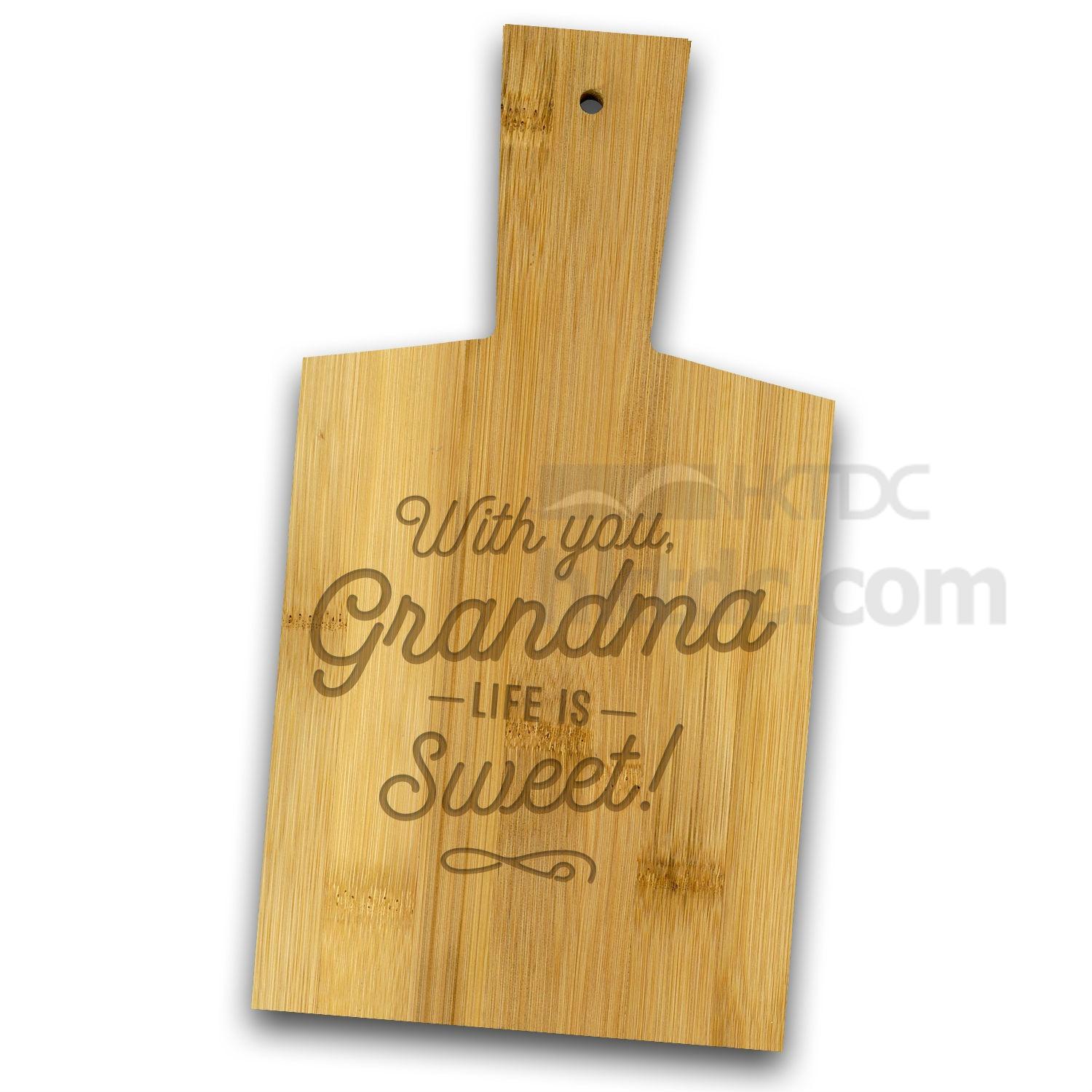 Serving board with text 'With you Grandma, life is sweet' is part of the gift concept called 'Bamboo Serving Board'