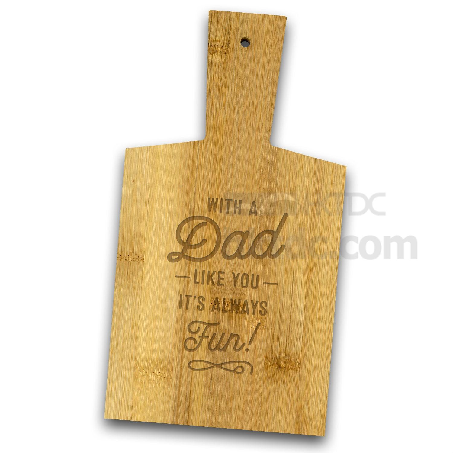 Serving board with text 'With a Dad like you, it's always Fun!' is part of the gift concept called 'Bamboo Serving Board'